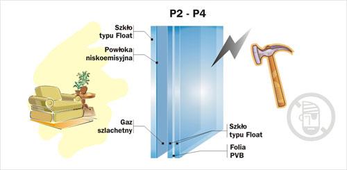Pakiet dwuszynowy od strony zewnętrznej zbudowana jest z szyby 4mm, czterech folii o grubości 0,38 mm i szyby 4mm. Takie rozwiązanie zapewnia większą odporność na włamania.